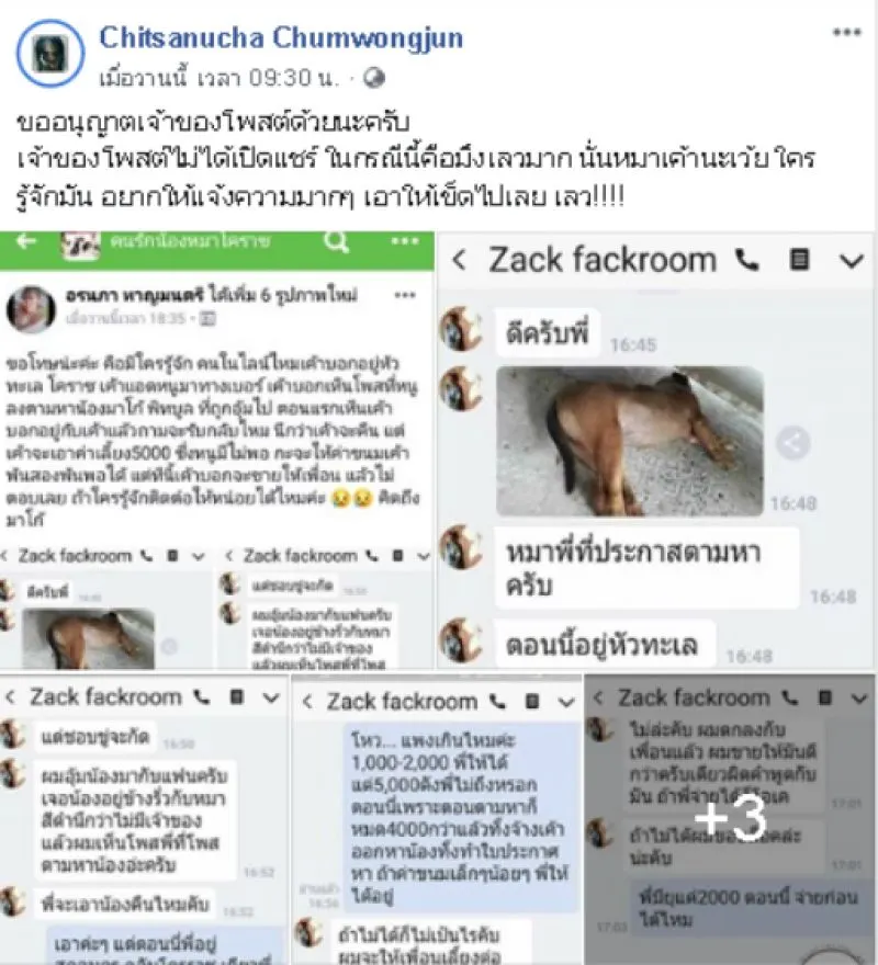 อย่างไรก็ตาม ผู้ใช้เฟซบุ๊ก Chitsanucha Chumwongjun ได้นำเรื่องราวดังกล่าวมาโพสต์เป็นสาธารณะเพื่อตามหาคนที่อุ้มสุนัขตัวนี้ไป จนมีผู้ใช้เฟซบุ๊กแชร์เรื่องราวไปแล้วไม่ต่ำกว่า 1,600 ครั้ง และแสดงความคิดเห็นต่อการกระทำของคนที่อุ้มไปดังกล่าว.