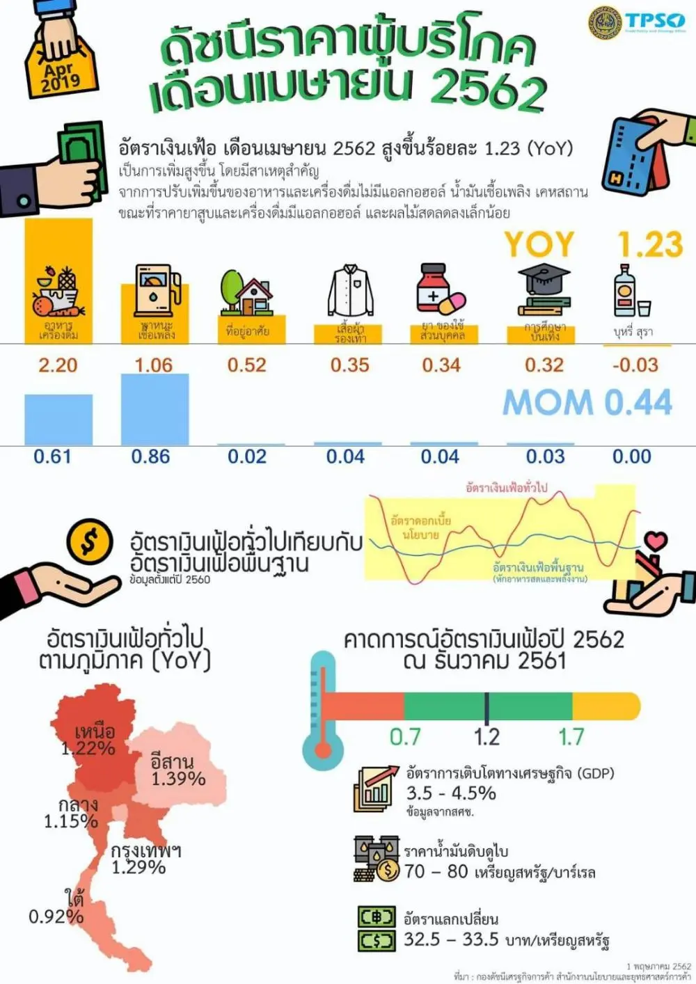 โดยอัตราเงินเฟ้อทั่วไปเดือน เม.ย.2562 ที่ขยายตัวดังกล่าว มีสาเหตุหลักจากการเพิ่มขึ้นของราคาอาหารสด โดยเฉพาะราคาผักที่เพิ่มขึ้นเกือบทุกตัว เนื่องจากสถานการณ์ภัยแล้ง ทำให้มีผลผลิตออกสู่ตลาดน้อยลงและเสียหายเร็วขึ้น ราคาพลังงานปรับตัวเพิ่มขึ้น ซึ่งเป็นผลจากราคาน้ำมันที่เพิ่มขึ้น 2.33% ในขณะที่ค่าโดยสารรถเมล์ในเขตกรุงเทพและปริมณฑลเพิ่มขึ้น 1.9% และราคาค่าเช่าบ้านเพิ่มขึ้นต่อเนื่องมา 2-3 เดือนแล้ว