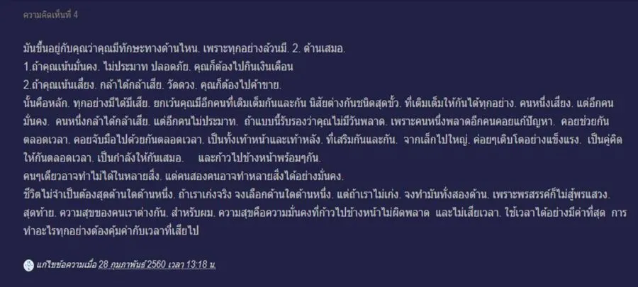คนๆเดียวอาจทำไม่ได้ในหลายสิ่ง แต่คนสองคนอาจทำหลายสิ่งได้อย่างมั่นคง ชีวิตไม่จำเป็นต้องสุดด้านใดด้านหนึ่งถ้าเราเก่งจริงจงเลือกด้านใดด้านหนึ่งแต่ถ้าเราไม่เก่งจงทำมันทั่งสองด้านเพราะพรสรรค์ก็ไม่สู้พรแสวง สุดท้ายความสุขของคนเราต่างกันสำหรับผมความสุขคือความมั่นคงที่ก้าวไปข้างหน้าไม่ผิดพลาดและไม่เสียเวลา ใช้เวลาได้อย่างมีค่าที่สุด การทำอะไรทุกอย่างต้องคุ้มค่ากับเวลาที่เสียไป