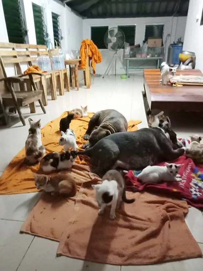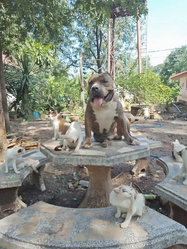 พิทบูลเลี้ยงลูกแมวถูกทิ้งวัดนับสิบ ดูแลมุ้งมิ้งราวกับลูกแท้ๆของตัวเอง