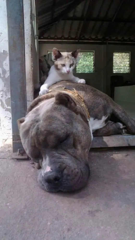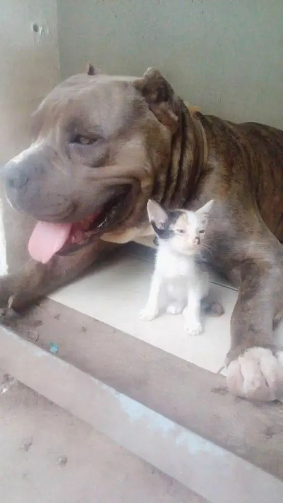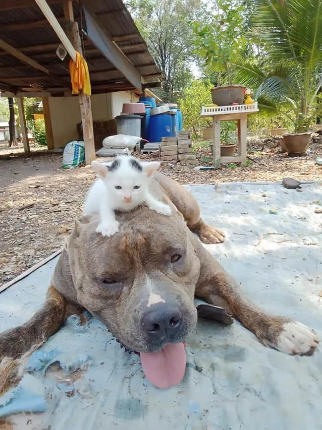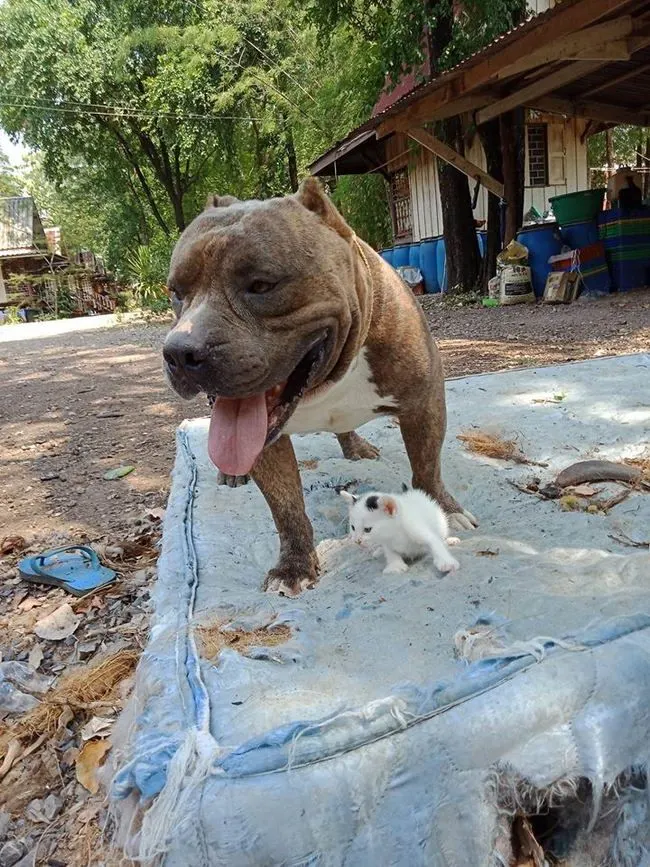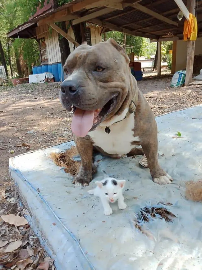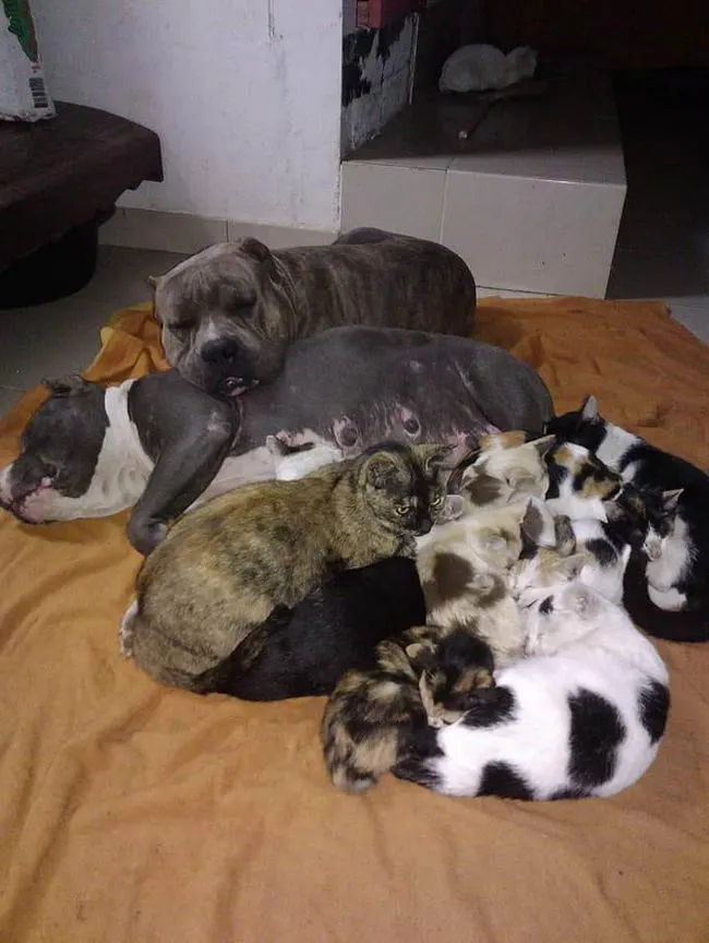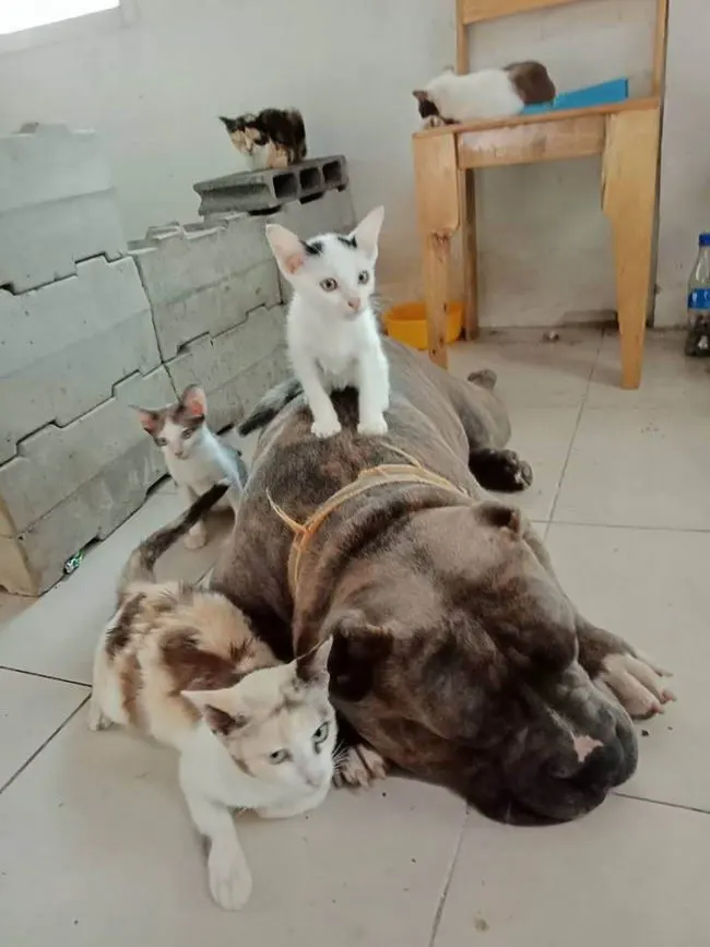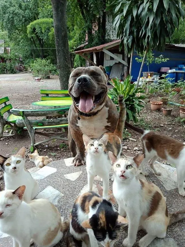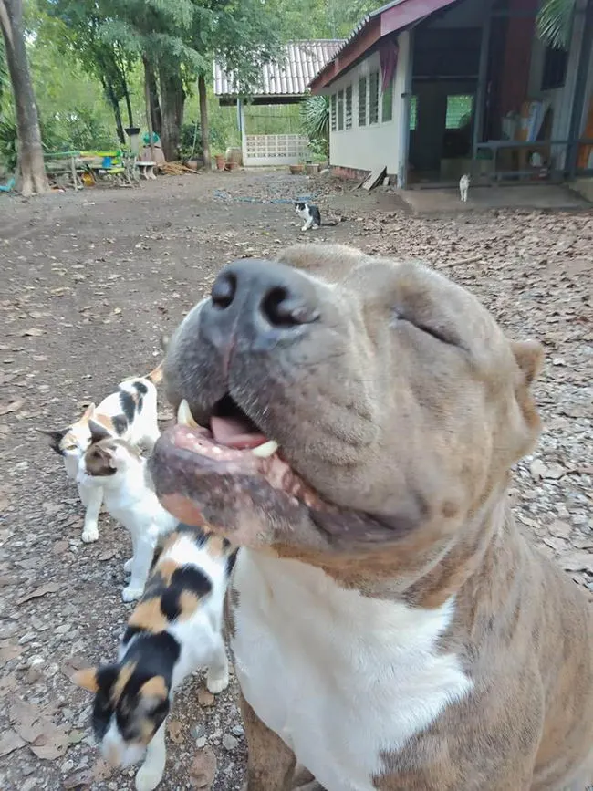 พิตบูลตัวนี้มีชื่อว่าโคล่าเป็นพี่ใหญ่ใจดีที่ไม่ว่าลูกแมวตัวไหนถูกทิ้งมา มันก็จะรับเลี้ยงไว้เป็นอย่างดี