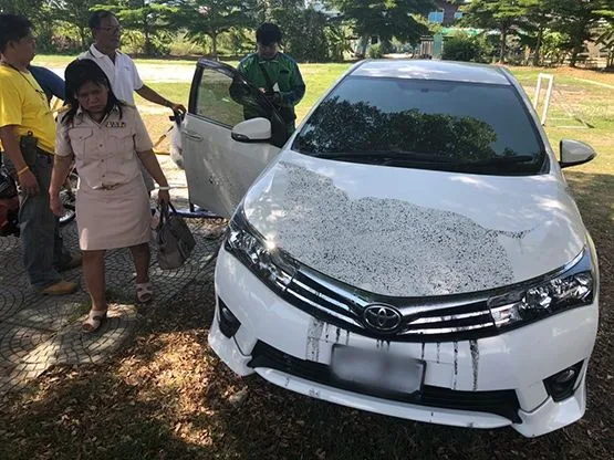 ในที่เกิดเหตุพบ รถยนต์นั่งส่วนบุคคลยี่ห้อโตโยต้า รุ่นอัลติส สีขาว โดนน้ำยาลอกสีเกือบทั้งคัน ได้รับความเสียหายเป็นจำนวนมาก ทราบชื่อเจ้าของรถคือ นางยุพิน วันดี อายุ 52 ปี ผอ.กองวิชาการและแผนงาน ซึ่งก็ได้ยืนอยู่ในที่เกิดเหตุด้วย