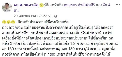 เมื่อวันที่ 29 เม.ย. 62 ที่ผ่านมา ทางด้านสมาชิกเฟสบุ๊คชื่อ "ธเรศ ยศอาลัย" ได้โพสต์เรื่องราวการลงพื้นที่เพื่อ สุ่มตรวจสอบ เครื่องชั่งที่ขายทุเรียน บริเวณถนนหางดง-เชียงใหม่ ผลออกมาปรากฎว่า หลายเจ้ามีการโกงตราชั่งเกิดขึ้น จึงได้ทำการแจ้งเตือนไว้ดังต่อไปนี้..