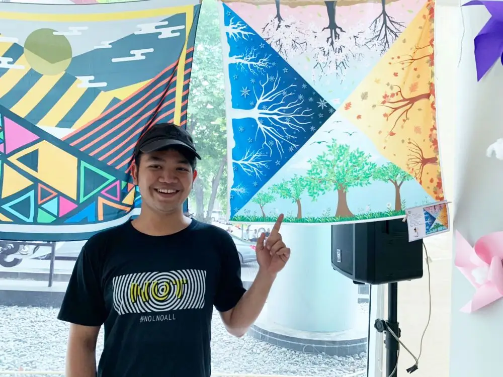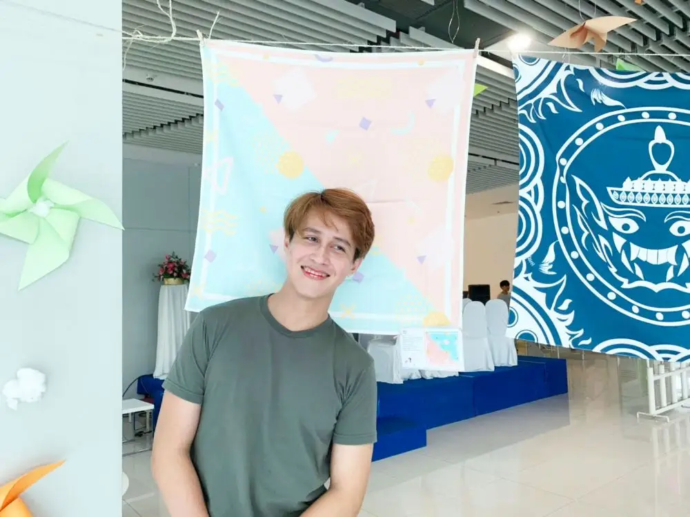 นายเจษฎา วิชัยกุล นักศึกษาสาขาการออบแบบกราฟิก สำหรับผลงานผ้าพันคอที่ใช้ในการจัดแสดงในงานนิทรรศการ “ปลิวลม” ในครั้งนี้ ใช้ชื่อว่า Sweetness โดยได้ Concept จากการนำลายกราฟิกจากลักษณะของการใช้เส้น จุด และรูปทรงเรขาคณิต มาผสมผสานให้เข้ากัน โดยใช้โทนสีสเทลเพื่อสื่อถึงความอ่อนหวาน