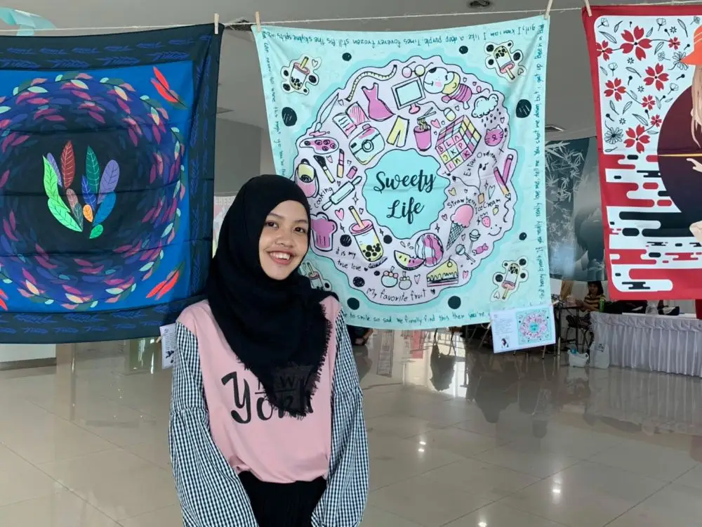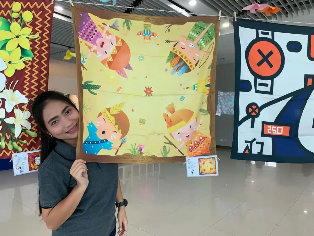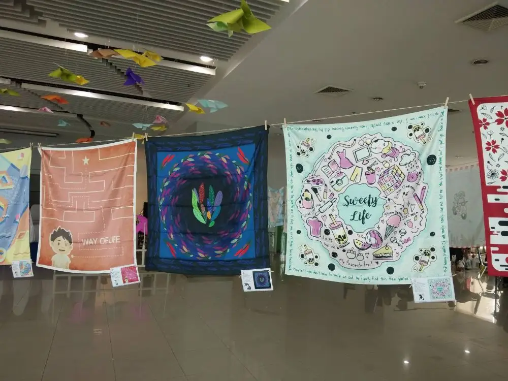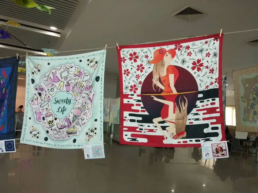 นางสาวเพ็ญพิชชา สร้อยมณีแสง นักศึกษาสาขาการออบแบบกราฟิก เล่าว่า สำหรับผลงานผ้าพันคอที่ใช้ในการจัดแสดงภายในงานครั้งนี้ ได้แรงบันดาลใจมาจากการนำสิ่งต่างๆที่ตัวเองชอบมารวมกันไว้ในผ้าพันคอ โดยจะเปรียบเทียบสิ่งที่ตัวเองชอบเหมือนกับความหวาน และตั้งชื่อผลงานว่า Sweety Life