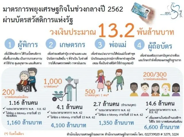 1.1 มาตรการเพิ่มเบี้ยคนพิการ เพื่อช่วยเหลือผู้มีรายได้น้อยที่เป็นผู้พิการให้ได้รับเบี้ยผู้พิการเพิ่มขึ้นจากเดิม ซึ่งจะช่วยบรรเทาภาระค่าใช้จ่ายในชีวิตประจำวัน เป็นจำนวนเงิน 200 บาทต่อคนต่อเดือน เป็นระยะเวลา 5 เดือน ตั้งแต่เดือนพฤษภาคมถึงเดือนกันยายน 2562 โดยจะต้องเป็นผู้มีรายได้น้อยที่มีบัตรประจำตัวคนพิการเท่านั้น และสามารถใช้ซื้อสินค้าและบริการผ่านเครื่องรับชำระเงินอิเล็กทรอนิกส์ (Electronic Data Capture: EDC) แอปพลิเคชันถุงเงินประชารัฐ หรือถอนเงินสดจากเครื่องถอนเงินอัตโนมัติได้