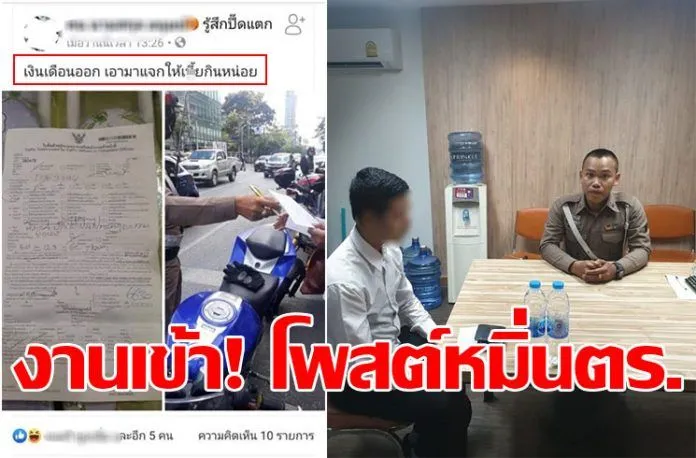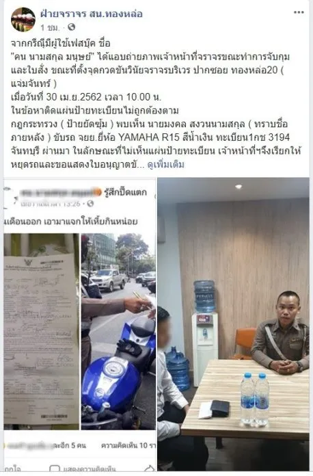 ทางเพจ ฝ่ายจราจร สน.ทองหล่อ ได้โพสต์ว่า จากกรณีมีผู้ใช้เฟสบุ๊ค ชื่อ “คน นามสกุล มนุษย์” ได้แอบถ่ายภาพเจ้าหน้าที่จราจรขณะทำการจับกุมและใบสั่ง ขณะที่ตั้งจุดกวดขันวินัยจราจรบริเวร ปากซอย ทองหล่อ20 ( แจ่มจันทร์ ) เมื่อวันที่ 30 เม.ย.2562 เวลา 10.00 น. ในข้อหาติดแผ่นป้ายทะเบียนไม่ถูกต้องตามกฎกระทรวง ( ป้ายยัดซุ้ม ) โดยพบเห็น นายมงคล สงวนนามสกุล ( ทราบชื่อภายหลัง ) ขับรถ จยย.ยี่ห้อ YAMAHA R15 สีน้ำเงิน ทะเบียน1กช 3194 จันทบุรี ผ่านมา ในลักษณะที่ไม่เห็นแผ่นป้ายทะเบียน เจ้าหน้าที่ฯจึงเรียกให้หยุดรถ และขอแสดงใบอนุญาตขับขี่พร้อมแสดงสำเนาคู่มือจดทะเบียนรถ จึงได้ดำเนินการออกใบสั่ง ในข้อหาติดแผ่นป้ายทะเบียนไม่ถูกต้องตามกฎกระทรวง ( ป้ายยัดซุ้ม )