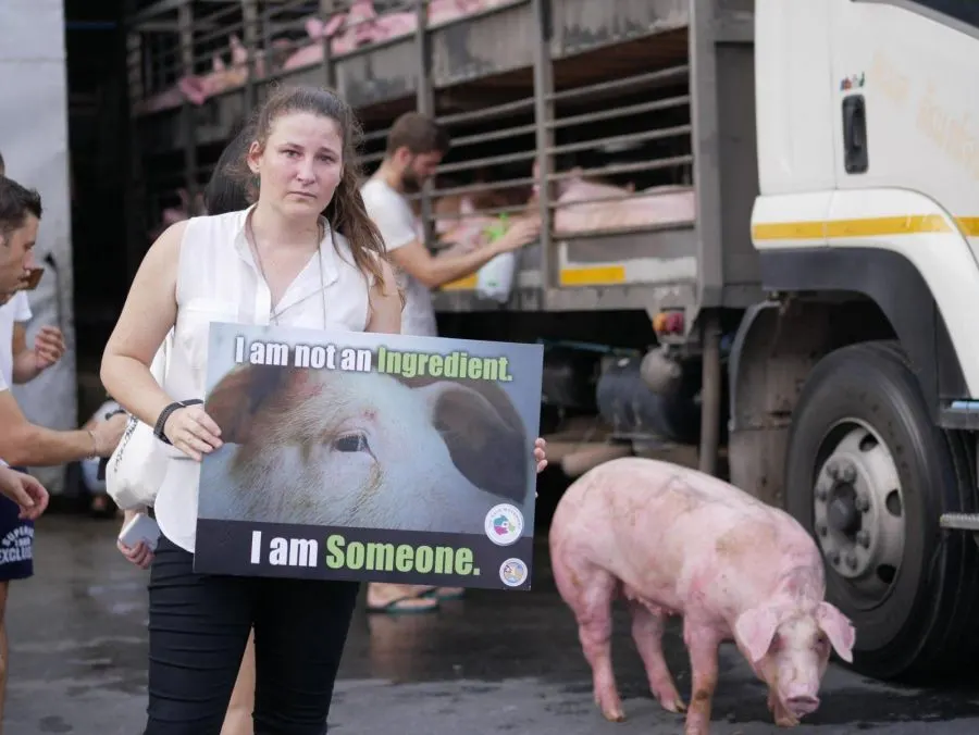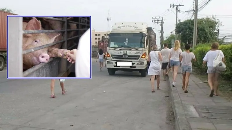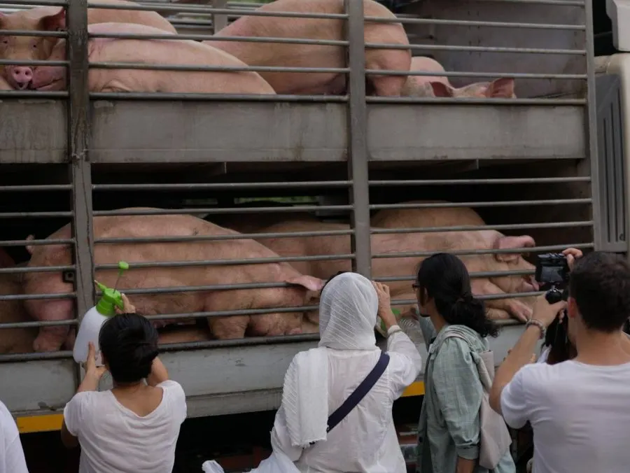 ภาพสุดสะเทือนใจ! กลุ่มช่วยเหลือสัตว์ในกรุงเทพฯ รวมตัวกันไปยืนขวางทาง “รถขนหมู” ขณะกำลังขับไปโรงเชือด