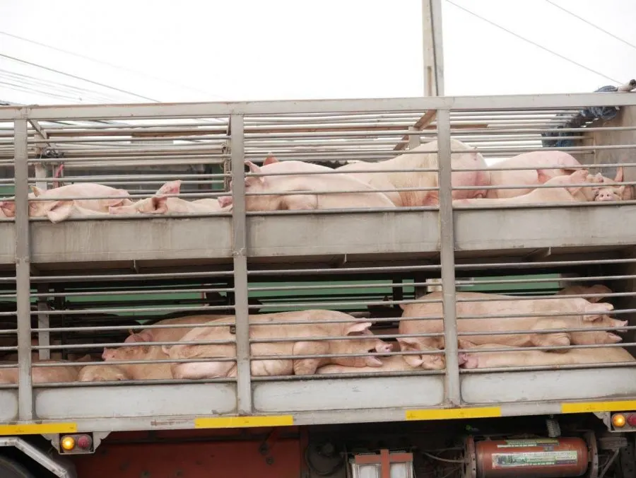 11 หมูเกิดอาการเครียด จึงกัดกรงเหล็กบนรถบรรทุก
