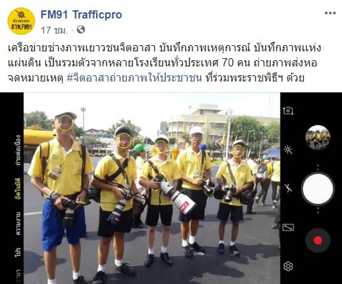 วันที่ 5 พฤษภาคม 2562 Facebook นึง.... ได้โพสต์ภาพน้อง ๆ นักเรียน สมาชิกเครือข่ายช่างภาพเยาวชนจิตอาสาที่มาร่วมบันทึกภาพเหตุการณ์ครั้งประวัติศาสตร์ พระราชพิธีบรมราชาภิเษก พระบาทสมเด็จพระเจ้าอยู่หัว รัชกาลที่ 10 โดยเป็นรวมตัวกันจากหลายโรงเรียนทั่วประเทศ จำนวน 70 คน เป็นจิตอาสาถ่ายภาพให้ประชาชน เพื่อถ่ายภาพส่งหอจดหมายเหตุ