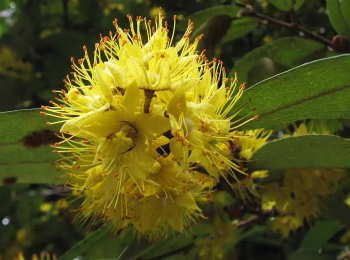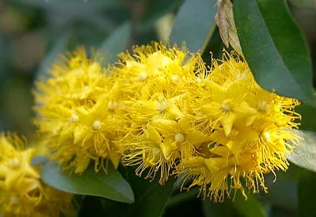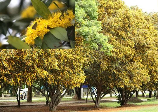 ดอกรวงผึ้ง เป็นช่อ สีเหลืองอร่าม ออกดอกเป็นช่อตามซอกใบ ลักษณะดอกมีกลีบเลี้ยง 5 แฉก ติดกับโคนกลีบและเป็นฐานรองกระจุกเกสรตัวผู้ ไม่มีกลีบดอก มีกลื่นหอมตลอดทั้งวันคล้ายกลิ่นน้ำผึ้ง แต่จะออกดอกครั้งละ 7-10 วันเท่าต่อปี ในช่วงเดือนกรกฎาคม - สิงหาคม