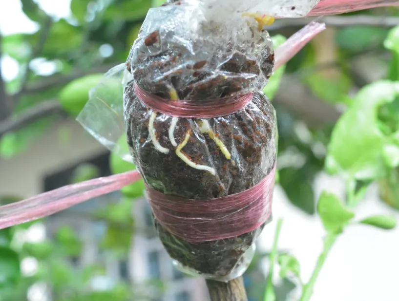 - นำดินเหนียวและกาบมะพร้าวชุบน้ำหุ้มไว้โดยพลาสติกและมัดเชือกปิดมิดชิด แล้วจึงรดน้ำตามปกติ