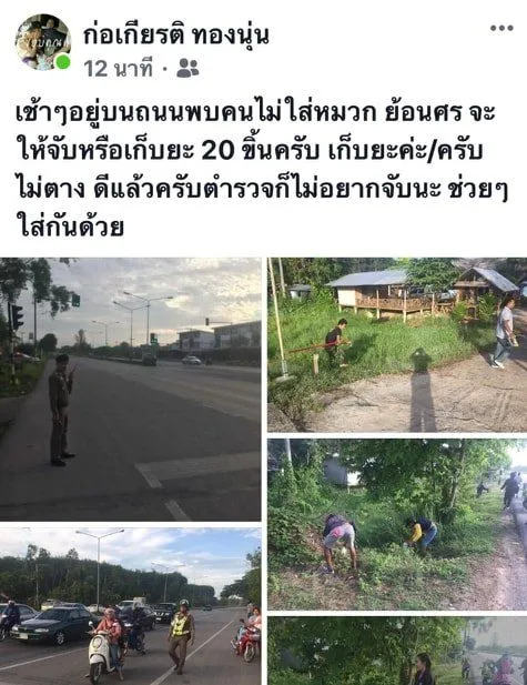 มื่อวันที่ 2 พ.ค. ที่ผ่านมา ได้มีชาวโลกโซเชี่ยลเข่าไปชมภาพในเฟซบุ๊คของ “ก่อเกียรติ ทองนุ่น” ซึ่งเป็นภาพการตั้งด้านตรวจจับการกระทำผิดวินัยการจราจร และภาพชาวบ้านช่วยกันเก็บขยะมูลฝอยริมถนน พร้อมขอความว่า “ เช้า ๆ อยู่บนถนนพบคนไม่ใส่หมวกกันน็อค จะให้จับหรือเก็บยะ 20 ชิ้นครับ เก็บยะค่ะ/ครับ ไม่ตาง ดีแล้วครับตำรวจกำไม่อยากจับ ช่วย ๆ ใส่กันด้วยนะ” โดยผู้ที่เข้าต่างแสดงความคิดเห็นในลักษณะยกย่องชื่นชมเจ้าหน้าที่ตำรวจเป็นอย่างมาก
