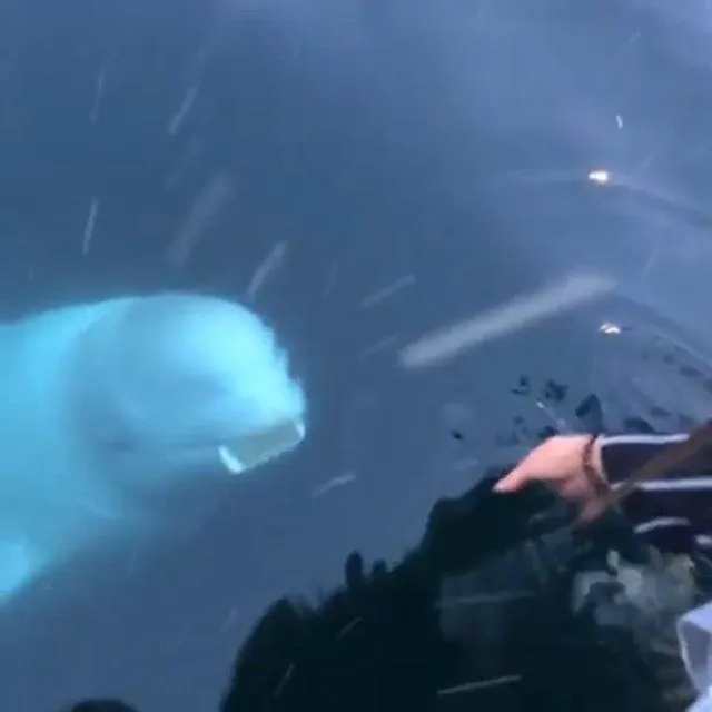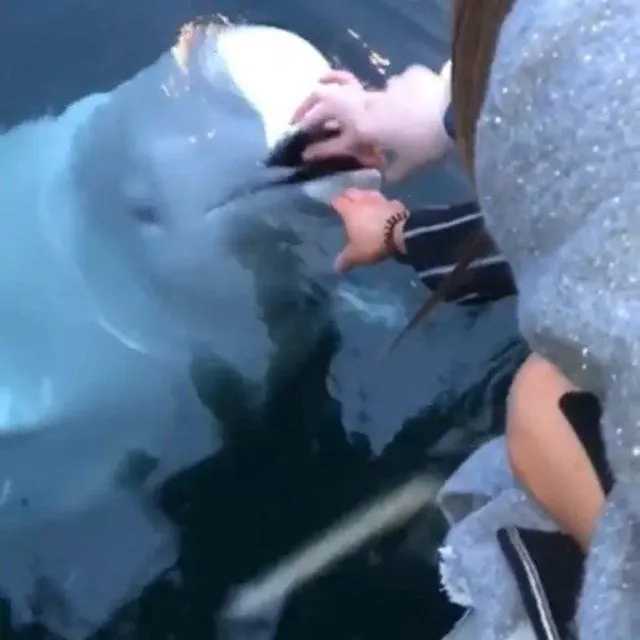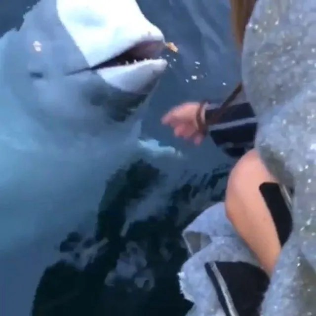 ภาพจากคลิปวิดีโอสั้นๆ เผยให้เห็นวาฬเบลูกา หรือวาฬขาว ลอยตัวขึ้นมาบนพื้นผิวน้ำพร้อมคาบโทรศัพท์มือถือ iPhone ที่นักท่องเที่ยวเผลอทำหล่นลงไปในน้ำทะเล