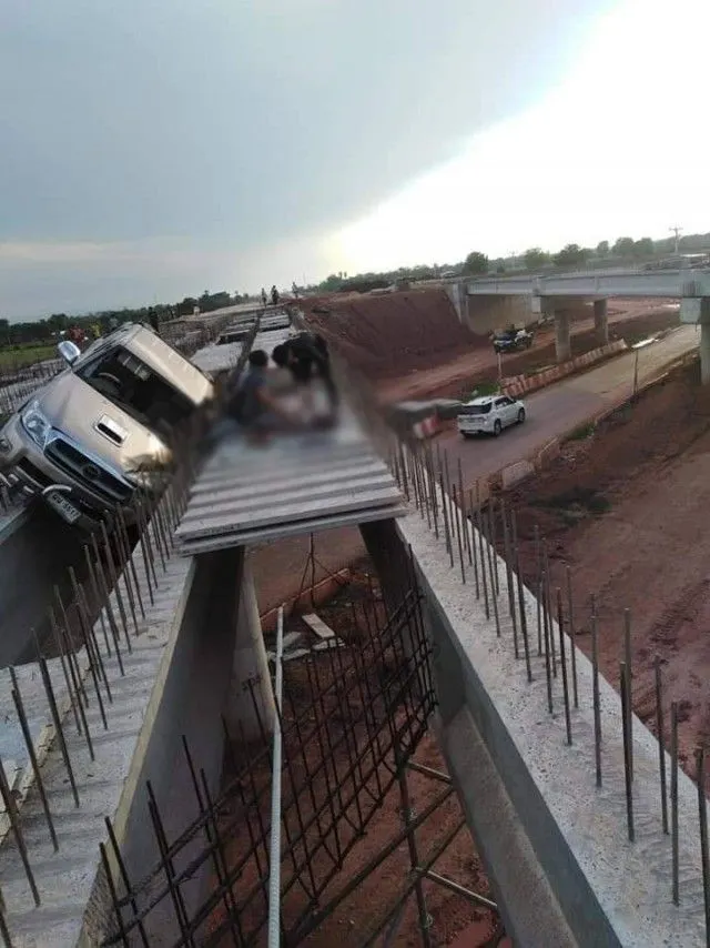 โดยประเด็นที่ชาวเน็ตต่างสงสัยก็คือ รถกระบะคันดังกล่าวขับขึ้นไปบนนั้นได้อย่างไร ซึ่งสาเหตุนี้คนงานก่อสร้างรายหนึ่ง กล่าวว่า เหตุการณ์ดังกล่าวเกิดขึ้นเมื่อช่วงเย็นวันที่ 5 พ.ค. เวลาประมาณ 17.30 น. ซึ่งเป็นช่วงที่คนงานก่อสร้างเลิกงานกันหมดแล้ว ก็ได้มีรถกระบะคันดังกล่าว วิ่งมาอย่างเร็ว พุ่งเข้าไปในบริเวณที่กำลังก่อสร้างยังไม่เสร็จ ซึ่งคาดว่าจะวิ่งมาเร็วมาก จนรถพุ่งไปบนโครงเหล็กที่ชี้เรียงไว้ ไถลไปไกลเป็นระยะทางประมาณ40 เมตร เกือบถึงอีกฝั่งหนึ่ง โชคดีที่รถไปติดอยู่บริเวณร่องปูน ไม่ตกลงไปด้านล่าง