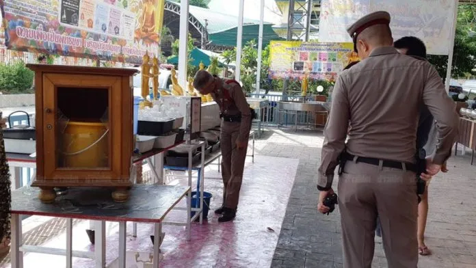 ที่เกิดเหตุ เป็นวิหารประดิษฐานพระพุทธรูป พบตู้ไม้ ใส่เงินทำบุญโลงศพผู้ไร้ญาติ สภาพถูกทุบกระจกแตก ใกล้กันพบตู้สแตนเลส สำหรับทำบุญน้ำมันตะเกียง สภาพถูกงัดแงะออก จากการตรวจสอบในตู้บริจาค 2 ตู้พบเงินสด จำนวนหนึ่งหายไป จากการสอบสวนลูกศิษย์วัด ให้การว่า เมื่อช่วงเช้าที่ผ่านมามีชาวบ้านใกล้เคียง เข้ามาทำบุญที่วัด และแจ้งว่า ตู้บริจาคถูกทุบกระจกแตก เมื่อตรวจสอบดูพบเงินในตู้บริจาคทั้ง 2 ตู้ ถูกขโมยหายไป ซึ่งเป็นเงินทีมาจากญาติโยมและชาวบ้านมาไหว้พระพุทธรูป ก่อนนำเงินบริจาคทำบุญใส่ไว้ในตู้ ซึ่งปกติแล้วทุกๆวันพระ จะมีการเปิดตู้บริจาคเพื่อนำเงินไปเก็บรักษาไว้ โดยแต่ละตู้จะมีเงิน รวมกว่า 1,000 บาท มีแบงก์ร้อย แบงก์ยี่สิบ และเงินเหรียญ ส่วนตู้บริจาค ที่ถูกคนร้ายมาทุบจนได้รับความเสียหาย จะวางไว้บริเวณรอบนอกวิหาร มีเพียงรั้วต่ำๆกั้นไว้ และไม่เคยมีใครเข้ามาขโมยเงินบริจาค ครั้งนี้เป็นครั้งแรกที่ถูกทุบตู้บริจาค