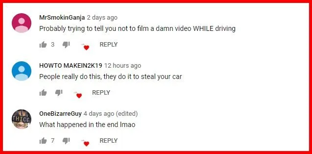 คอมเมนต์ชาวเน็ต บ้างก็แซวว่าคงอยากสั่งสอนให้หญิงสาวรู้ว่าไม่ควรตั้งกล้องถ่ายขณะขับรถ บ้างก็ว่าทำแบบนี้อาจจะหวังเข้าจี้ปล้นก็เป็นได้
