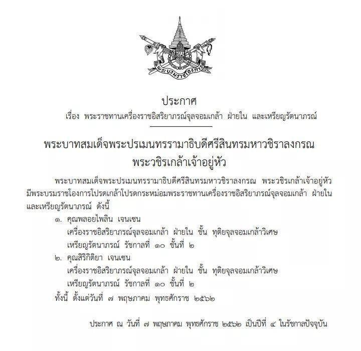 ในหลวงร.10 พระราชทานเครื่องราชอิสริยาภรณ์ฯ ฝ่ายใน แด่คุณพลอยไพลินและคุณสิริกิติยา