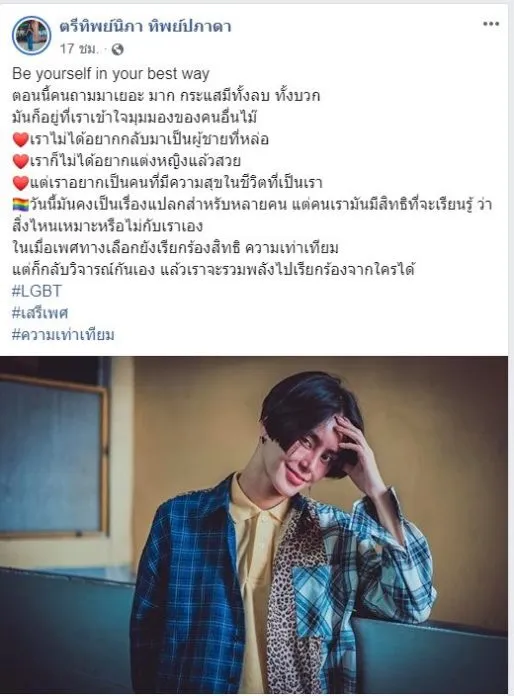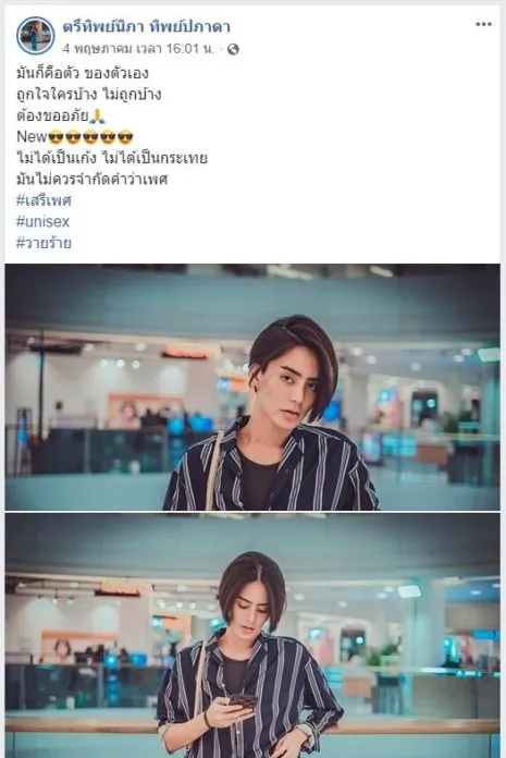 โดยโพสต์ข้อความระบุว่า “นี่คือตัวของตัวเอง ถูกใจใครบ้าง ไม่ถูกบ้าง ต้องขออภัย ตนไม่ได้เป็นเก้ง ไม่ได้เป็นกะเทย และมันไม่ควรจำกัดคำว่าเพศ พร้อมติดแฮชแท็ก #เสรีเพศ #unisex”