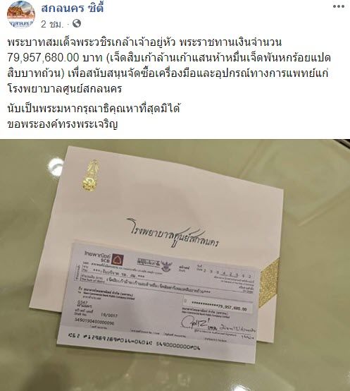 ล่าสุด เฟซบุ๊กเพจ สกลนคร ซิตี้ ได้ออกมาเผยภาพสุดประทับใจ เช็คเงินพระราชทานจากพระบาทสมเด็จพระเจ้าอยู่หัว เป็นเงิน 79 ล้านบาท พร้อมระบุว่า...