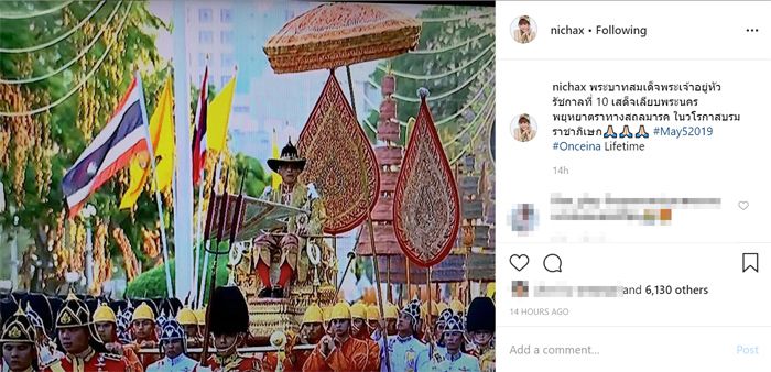 วันที่ 5 พ.ค. ทูลกระหม่อมหญิงอุบลรัตนราชกัญญา สิริวัฒนาพรรณวดี ทรงโพสต์ภาพ พระบาทสมเด็จพระเจ้าอยู่หัว เสด็จเลียบพระนคร และทรงโพสต์ข้อความว่า “พระบาทสมเด็จพระเจ้าอยู่หัวรัชกาลที่ 10 เสด็จเลียบพระนครพยุหยาตราทางสถลมารค ในวโรกาสบรมราชาภิเษก #May52019 #Onceina Lifetime”