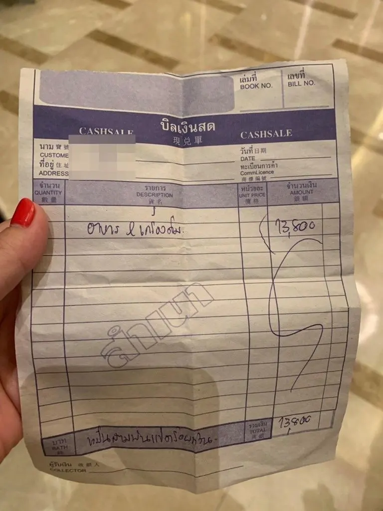 ส่วนไอ้คนขับ หายไปแล้ว แล้วพนักงานก็มาเช็คบิล ทั้งหมด 13,800 บาท ซึ่งเราเข้าไป 5นาที ไม่ได้สั่ง หรือนั่งดื่มอะไรเลย แล้วพนักงานก็มารุมหน้ารุมหลัง 4-5คน ด้วยความตกใจกลัว ในเวลานั้น ร้านมืดมากๆ เลยต้องยอมจ่าย และได้บอกพนักงานว่าคิดเงินผิดหรือเปล่า หรือ ยกเลิกได้ไหม พนักงานไม่ยอมยกเลิก ต้องให้จ่ายถึงออกร้านได้ เลยต้องควักเงินจ่ายเปนเงินสด ทั้งหมด