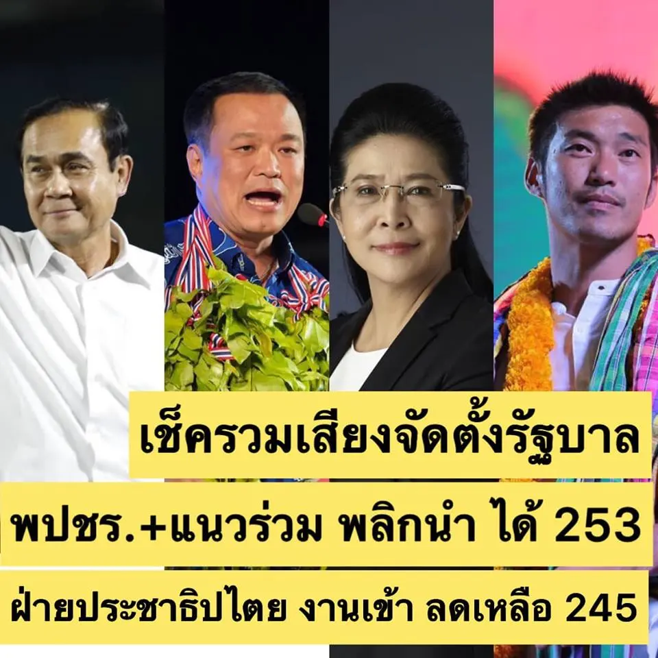 เช็ครวมเสียงจัดตั้งรัฐบาล พปชร.และแนวร่วม พลิกนำ 253 เสียง ด้านฝ่ายประชาธิปไตย งานเข้า ลดเหลือ 245