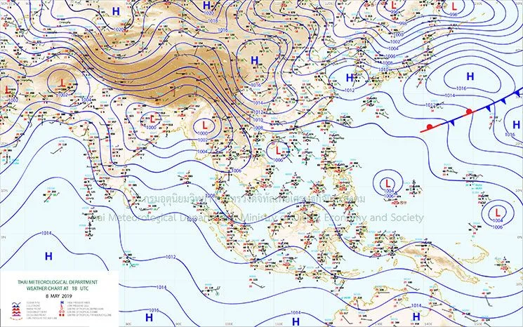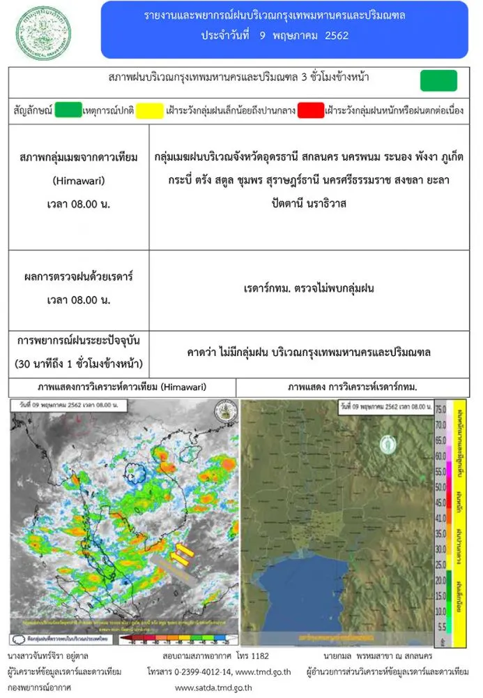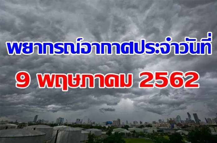 วันที่ 9 พ.ค.62 พยากรณ์อากาศ 24 ชั่วโมงข้างหน้า ประเทศไทยตอนบนมีอากาศร้อนถึงร้อนจัด กับมีฝนฟ้าคะนองและลมกระโชกแรง บริเวณภาคเหนือ ภาคตะวันออกเฉียงเหนือ ภาคกลาง และภาคตะวันออก ขอให้ประชาชนบริเวณดังกล่าวระวังอันตรายจากฝนฟ้าคะนอง ลมกระโชกแรง รวมถึงฟ้าผ่า ควรอยู่ห่างจากต้นไม้ใหญ่ สิ่งปลูกสร้าง และป้ายโฆษณาที่ไม่แข็งแรง สำหรับภาคใต้ยังคงมีฝนฟ้าคะนองกับมีฝนตกหนักบางแห่งอย่างต่อเนื่อง ส่วนทะเลอันดามันมีคลื่นสูงประมาณ 2 เมตร บริเวณที่มีฝนฟ้าคะนองคลื่นสูงมากกว่า 2 เมตร ขอให้ชาวเรือบริเวณดังกล่าวเดินเรือด้วยความระมัดระวัง
