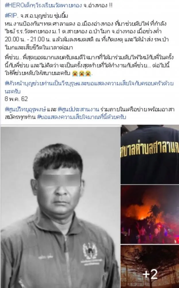 #RIP. จ.ส.อ.บุญช่วย ชุ่มยิ้ม หน.งานป้องกันฯ ทต.ศาลาแดง อ.เมืองอ่างทอง ที่มาช่วยดับไฟ ที่กำลังไหม้ ร.ร.วัดพายทอง ม.1 ต.สายทอง อ.ป่าโมก จ.อ่างทอง เมื่อช่วงค่ำ 20.00 น. – 21.00 น. แล้วล้มลงหมดสติ ณ ที่เกิดเหตุ และได้นำส่ง รพ.ป่าโมกและเสียชีวิตในเวลาต่อมา