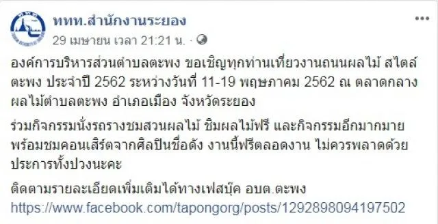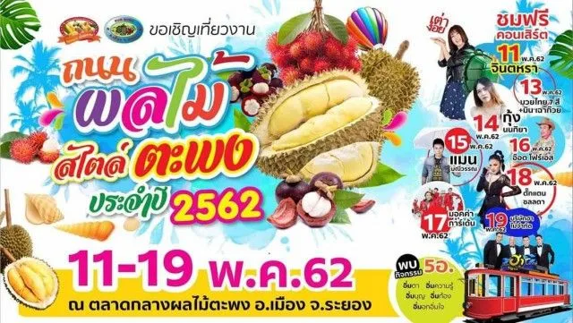 เป็นอีกหนึ่งเรื่องราวที่ชาวเน็ตแห่แชร์ และให้ความสนใจกันเป็นจำนวนมาก เมื่อมีผู้ใช้เฟสบุ๊คชื่อ ททท.สำนักงานระยอง ได้ออกมาโพสต์เรื่องราวโดยได้ระบุข้อความว่า… องค์การบริหารส่วนตำบลตะพง ขอเชิญทุกท่านเที่ยวงานถนนผลไม้ สไตล์ตะพง ประจำปี 2562 ระหว่างวันที่ 11-19 พฤษภาคม 2562 ณ ตลาดกลางผลไม้ตำบลตะพง อำเภอเมือง จังหวัดระยองร่วมกิจกรรมนั่งรถรางชมสวนผลไม้ ชิมผลไม้ฟรี และกิจกรรมอีกมากมาย พร้อมชมคอนเสิร์ตจากศิลปินชื่อดัง งานนี้ฟรีตลอดงาน ไม่ควรพลาดด้วยประการทั้งปวงนะคะ
