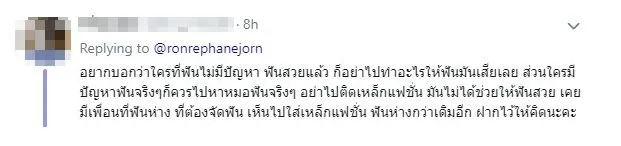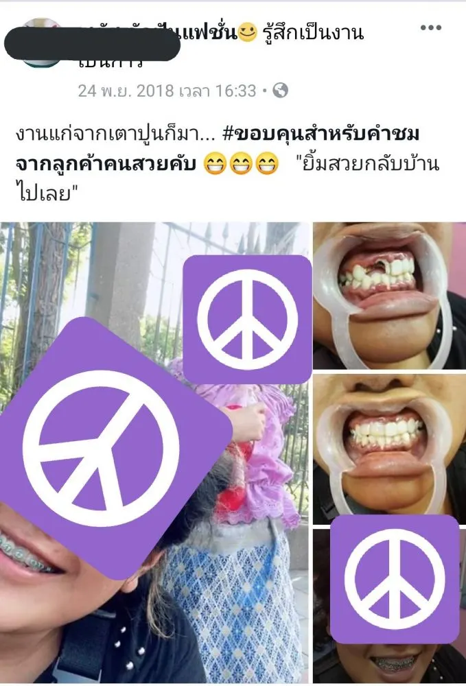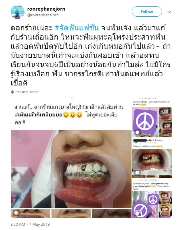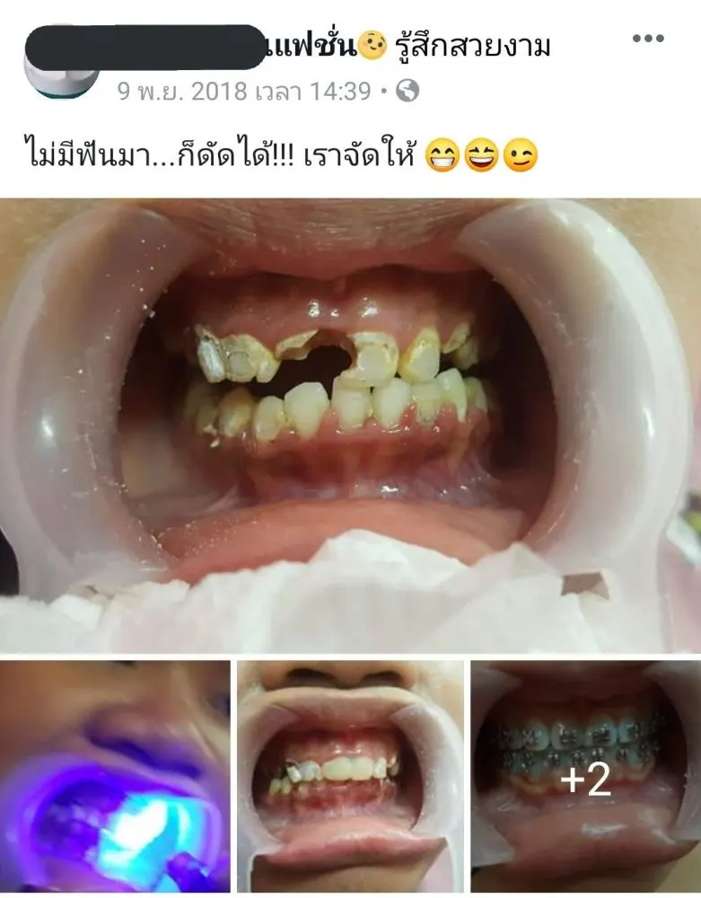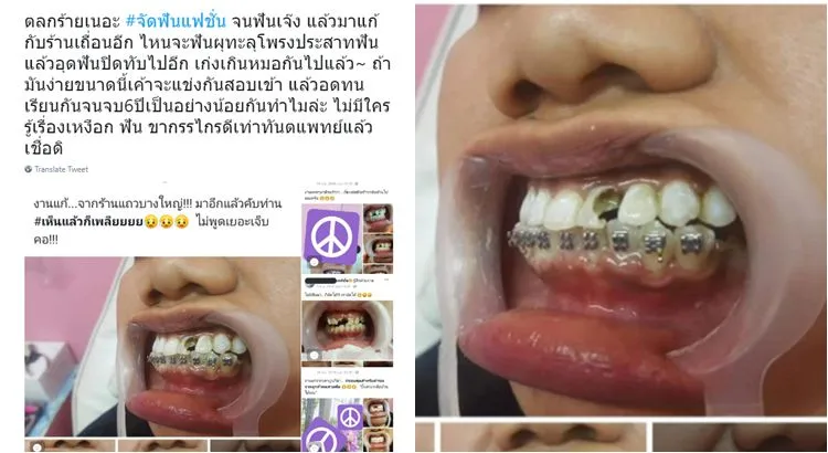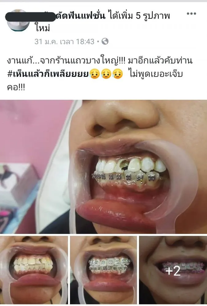 ทวิตเตอร์ @ronrephanejorn ได้โพสต์ภาพจากเฟซบุ๊กของร้านจัดฟันแฟชั่น ซึ่งได้โพสต์ภาพลูกค้าวัยรุ่นเข้ามาให้ร้านแก้ปัญหา หลังจากจัดฟันแฟชั่นจนฟันเสียหายหนัก โดยระบุว่า