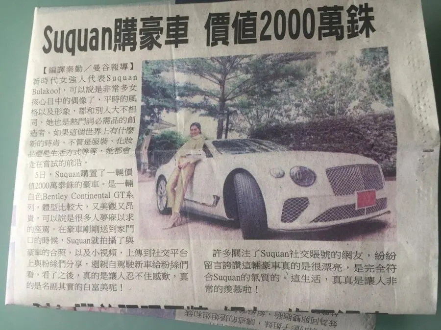หนังสือพิมพ์ภาษาจีนเจ้าหนึ่ง ก็นำเรื่องนี้ไปตีข่าว จนทำให้สู่ขวัญ ต้องขอออกมาแจงว่า รถคันดังกล่าวไม่ใช่รถของตน ตนไม่ได้ซื้อ ไม่ได้เป็นเจ้าของ เพียงแค่ทางแบรนด์ส่งมาให้ขับฟรี ๆ ในช่วงสุดสัปดาห์ที่ผ่านมา ถึงแม้จะไม่มีอะไรเสียหาย แต่ก็ต้องเรียนให้ทราบว่า ไม่ใช่เจ้าของรถ