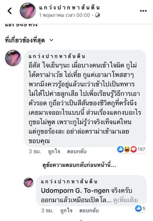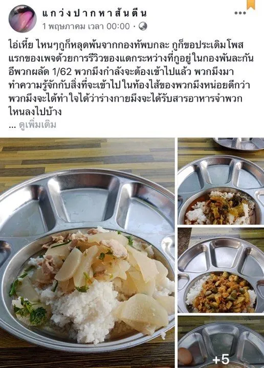 พ.ค.62 ที่ผ่านมาได้มีเพจที่ชื่อว่า แ ก ว่ ง ป า ก ห า ส้ น ตี น ได้โพสเกี่ยวกับเมนูอาหารของโรงเลี้ยงทหารพร้อมภาพมีบทความว่า ไ อ่ เ ...้ ย ไหนๆกูก็หลุดพ้นจากกองทัพบกละ กูก็ขอประเดิมโพสแรกของเพจด้วยการรีวิวของแดกระหว่างที่กูอยู่ในกองพันละกัน อีพวกผลัด 1/62 พวกมึงกำลังจะต้องเข้าไปแล้ว พวก มึ ง มาทำความรู้จักกับสิ่งที่จะเข้าไปในท้องไส้ของพวก มึ ง หน่อยดีกว่า พวก มึ ง จะได้ทำใจได้ว่าร่างกาย มึ ง จะได้รับสารอาหารจำพวกไหนลงไปบ้าง