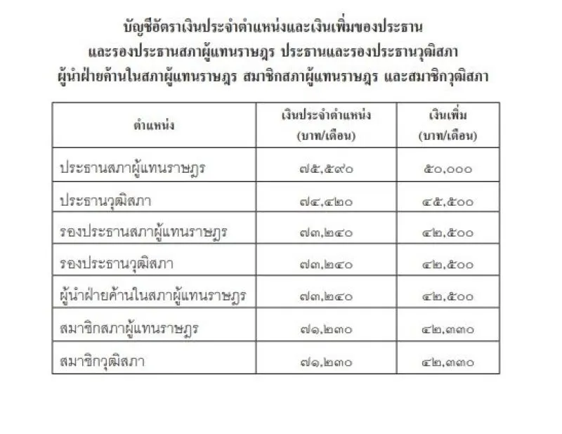 เงินประจำตำแหน่งเดือนละ 71,230 บาท เงินเพิ่มเดือนละ 42,330 บาท