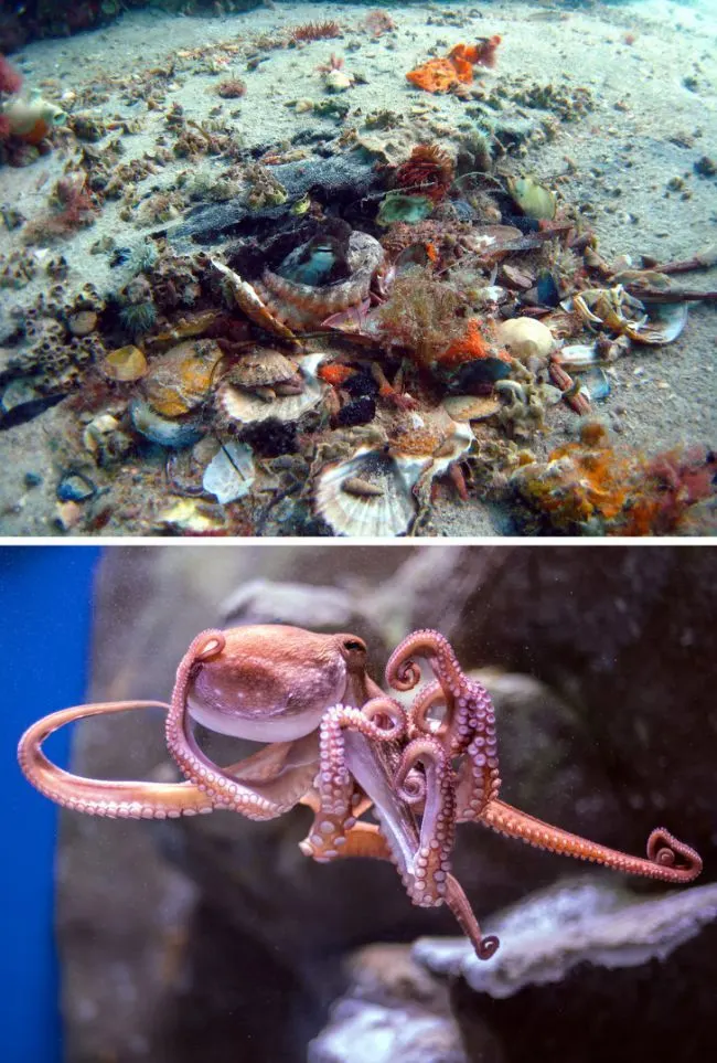 11 อ๊อกโตพูส ปลาหมึกยักษ์ จะรวบรวมวัตถุที่มันวาวและเปลือกหอยเพื่อสร้างสวนรอบๆ ที่พักของพวกมัน พวกมันทำเช่นนี้เพื่อรักษาและปกป้องตัวเองและบ้านของพวกมัน