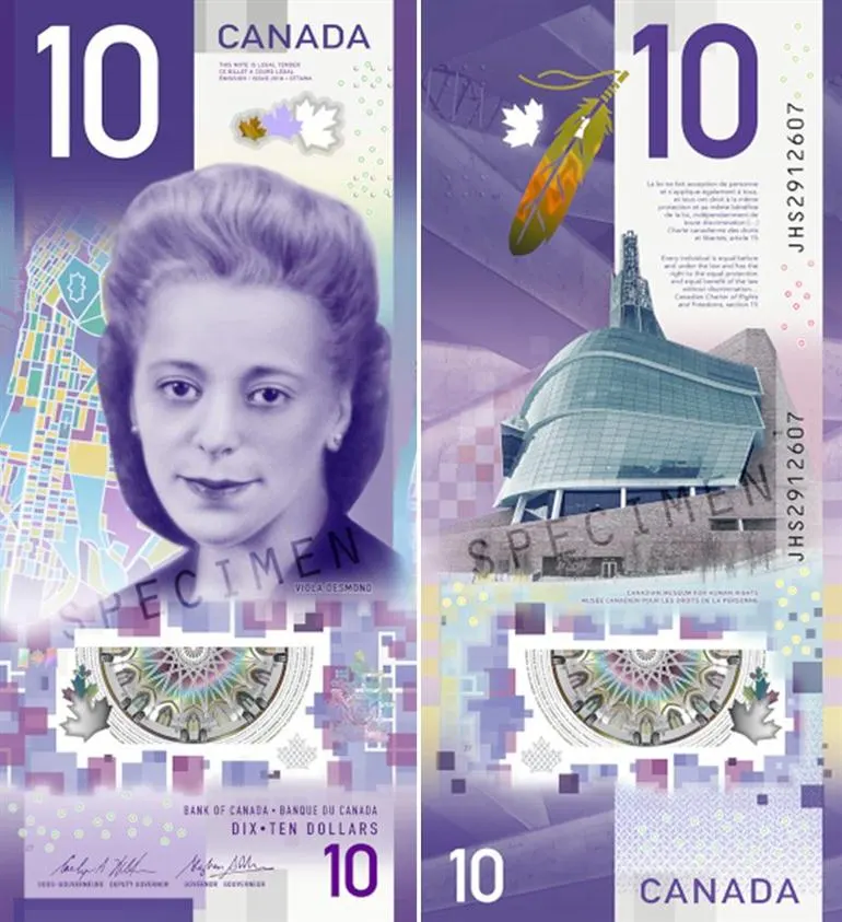บนธนบัตรดังกล่าวมีรูปของ วิโอลา เดสมอนด์ นักเคลื่อนไหวด้านสิทธิพลเมือง ผู้ต่อต้านการเหยียดผิว และเธอยังเป็นหญิงชาวแคนาดาคนแรกที่มีรูปปรากฏบนธนบัตรของประเทศอีกด้วย ขณะที่อันดับ 2 นั้นเป็นของธนบัตรฉบับ 200 ฟรังก์สวิส ของสวิตเซอร์แลนด์ ส่วนอันดับ 3 เป็นของธนบัตรฉบับ 500 โครเนอร์ของนอร์เวย์