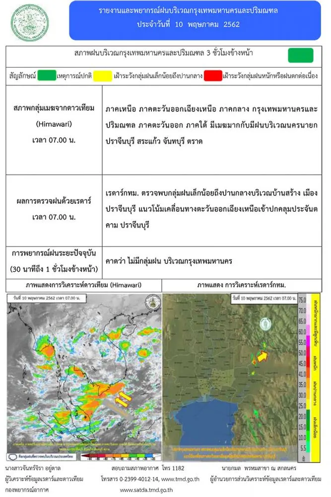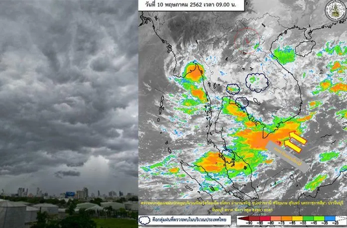 วันที่ 10 พ.ค.62 พยากรณ์อากาศ 24 ชั่วโมงข้างหน้า ประเทศไทยตอนบนมีอากาศร้อนโดยทั่วไป และมีอากาศร้อนจัดบางพื้นที่ กับมีฝนฟ้าคะนองและลมกระโชกแรง บริเวณภาคเหนือ ภาคตะวันออกเฉียงเหนือ ภาคกลาง และภาคตะวันออก ขอให้ประชาชนบริเวณดังกล่าวระวังอันตรายจากฝนฟ้าคะนอง ลมกระโชกแรง รวมถึงฟ้าผ่า ควรอยู่ห่างจากต้นไม้ใหญ่ สิ่งปลูกสร้าง และป้ายโฆษณาที่ไม่แข็งแรง สำหรับภาคใต้ยังคงมีฝนฟ้าคะนองอย่างต่อเนื่องกับมีฝนตกหนักบางแห่ง ส่วนทะเลอันดามันมีคลื่นสูง 2-3 เมตร บริเวณที่มีฝนฟ้าคะนองคลื่นสูงมากกว่า 3 เมตร ขอให้ชาวเรือบริเวณดังกล่าวเดินเรือด้วยความระมัดระวัง และเรือเล็กควรงดออกจากฝั่งในระยะ 1-2 วันนี้