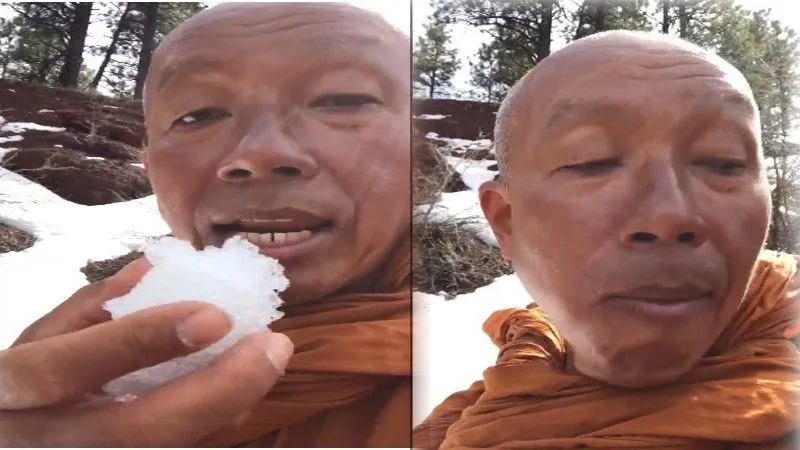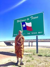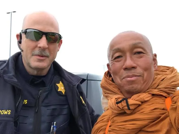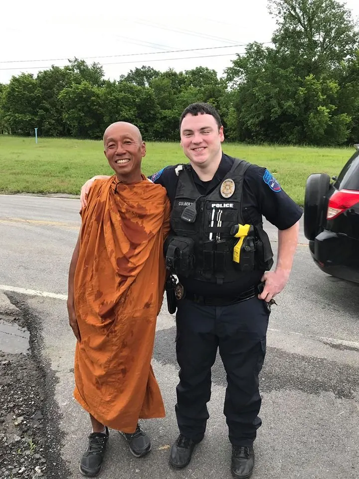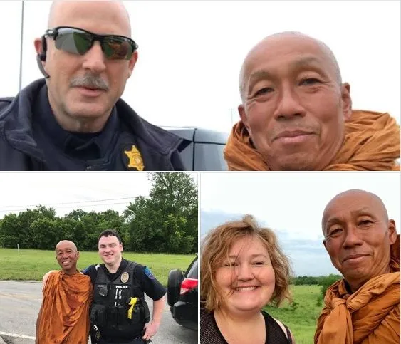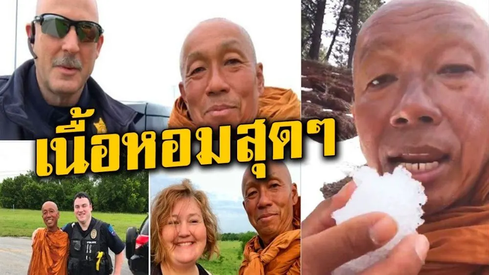 "วันนี้เราเดินถนน Route 66 การจราจรคับคั่ง ก็มีรถมาจอดฉุกเฉินข้างทาง แหม่มอเมริกันรีบจอดรถ แล้วขอถ่ายรูปพระธุดงค์ ทันใดนั้นรถตำรวจโฉบปาดหน้ามา แล้วลงไปขอดูใบขับขี่ แหม่มบอกว่า ฉันขอโทษน่ะ ฉันแค่จะถ่ายรูปพระธุดงค์ ตำรวจเลยมาถามพระว่า ไอเห็นยูในทีวี ถ้างั้น ไอขอถ่ายรูปยูด้วยน่ะ ตกลงก็ไม่ต้องออกใบสั่ง แต่ได้รูปพระธุดงค์กันไปคนล่ะรูป"