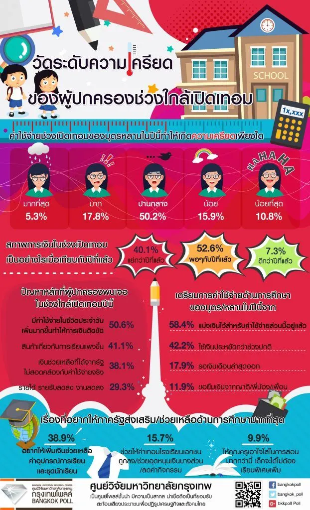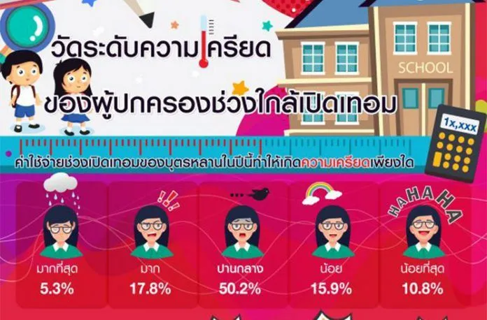 วันที่ 1 พ.ค.62 “กรุงเทพโพลล์” ศูนย์วิจัยมหาวิทยาลัยกรุงเทพ เปิดเผยผลสำรวจความคิดเห็นเรื่อง “วัดระดับความเครียดของผู้ปกครอง ช่วงใกล้เปิดเทอม” โดยเก็บข้อมูลจากผู้ปกครองที่มีบุตรหลานเรียนอยู่ในระดับชั้นอนุบาล – มัธยมศึกษา ทั้งสังกัดโรงเรียนรัฐบาลและโรงเรียนเอกชน ในพื้นที่กรุงเทพมหานครและปริมณฑล รวมทั้งสิ้น 1,149 คน ระหว่างวันที่ 3-8 พ.ค.ที่ผ่านมาพบว่า ผู้ปกครอง ส่วนใหญ่คือร้อยละ 50.2 มีความเครียดเรื่องค่าใช้จ่ายอยู่ในระดับปานกลาง รองลงมาร้อยละ 17.8 เครียดมาก และร้อยละ 15.9 เครียดน้อย โดยร้อยละ 50.6 ของผู้ปกครอง ระบุ มีค่าใช้จ่ายในชีวิตประจำวันเพิ่มมากขึ้น ทำให้การเงินติดขัด รองลงมาร้อยละ 41.1 สินค้าเกี่ยวกับการเรียนแพงขึ้น และร้อยละ 38.1 เงินช่วยเหลือที่ได้จากรัฐไม่สอดคล้องกับค่าใช้จ่ายจริง