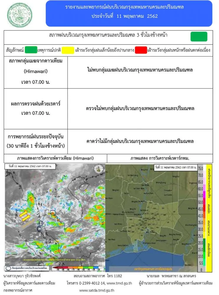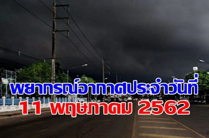 วันที่ 11พ.ค.62 กรมอุตุฯเผย พยากรณ์อากาศ 24 ชั่วโมงข้างหน้า บริเวณภาคเหนือตอนล่าง ภาคตะวันออกเฉียงเหนือ ภาคกลาง ภาคตะวันออก และภาคใต้ มีฝนฟ้าคะนองกับมีฝนตกหนักบางแห่งและลมกระโชกแรง ขอให้ประชาชนบริเวณดังกล่าวระวังอันตรายจากฝนที่ตกหนัก ฝนที่ตกสะสม ลมกระโชกแรง ควรอยู่ห่างจากต้นไม้ใหญ่ สิ่งปลูกสร้าง และป้ายโฆษณาที่ไม่แข็งแรง ส่วนภาคเหนือยังคงมีอากาศร้อนถึงร้อนจัด สำหรับทะเลอันดามันมีคลื่นสูงประมาณ 2 เมตร บริเวณที่มีฝนฟ้าคะนองคลื่นสูง 2-3 เมตร ขอให้ชาวเรือบริเวณดังกล่าวเดินเรือด้วยความระมัดระวัง