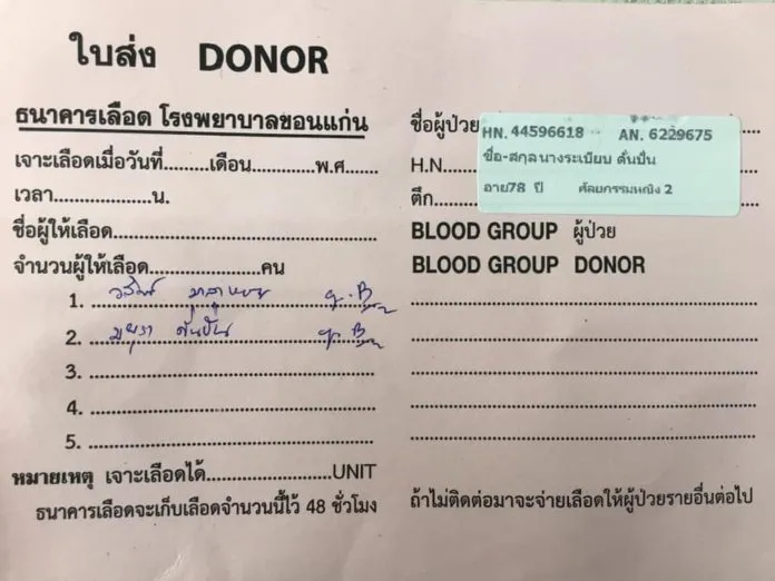 วันที่ 11 พ.ค. โดยผู้ใช้เฟซบุ๊กชื่อ เพ็ญนภา ดั่นปั่น โพสต์ภาพและข้อความขอความช่วยเหลือระบุว่า วอนผู้ใจดีมีจิตศรัทธาร่วมบริจาคให้กับ คุณย่าหนูด้วยค่ะเนื่องจากคุณย่าเสียเลือดมาก #ต้องการเลือดด่วน !!! (นางระเบียบ ดั่นปั่น) อายุ 78 ปี เลือดกรุ๊ป B