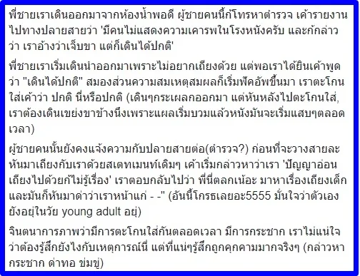 ผู้ชายคนนั้นยังคงแจ้งความกับปลายสายต่อ(ตำรวจ?) ก่อนที่จะวางสายละหันมาเถียงกับเราด้วยสเตทเมนท์เดิมๆ เค้าเริ่มกล่าวหาว่าเรา ‘ปัญญาอ่อน เถียงไปด้วยก็ไม่รู้เรื่อง’ เราตอบกลับไปว่า พี่นี่ตลกเนอะ มาหาเรื่องเถียงเด็ก และมันก็หันมาด่าว่าเราหน้าแก่ – -” (อันนี้โกรธเลยอะ5555 มั่นใจว่าตัวเองยังอยุ่ในวัย young adult อยู่) จินตนาการภาพว่ามีการตะโกนใส่กันตลอดเวลา มีการกระชาก เราไม่แน่ใจว่าต้องรู้สึกยังไงกับเหตุการณ์นี่ แต่ที่แน่ๆรู้สึกถูกคุกคามมากจริงๆ (กล่าวหา กระชาก ด่าทอ ข่มขู่)