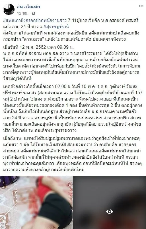 หนุ่มหึงหวงอดีตแฟนสาวมีคนรักใหม่ บุกยิงกรอกปากพนักงานสาว 7-11 ผู้บาดเจ็บ คือ น.ส.อรอนงค์ พรมศรีแก้ว อายุ 24 ปี ชาว จ.สุราษฎร์ธานี ตร.สั่งจับตายได้เลยทันที หากผู้ต้องหาต่อสู้ขัดขืน อดีตแฟนหนุ่มบ้าเลือดบุกยิงกรอกปาก "สาวเซเว่น" แต่ยังไม่ตายแค่เจ็บสาหัส ปมเหตุจากหึงหวง