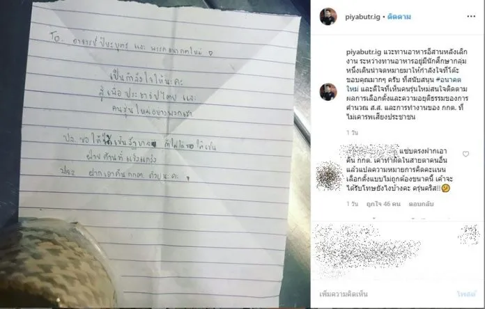 แวะทานอาหารอีสานหลังเลิกงาน ระหว่างทานอาหารอยู่มีนักศึกษากลุ่มหนึ่งเดินนำจดหมายมาให้กำลังใจที่โต๊ะ ขอบคุณมากๆ ครับ ที่สนับสนุน #อนาคตใหม่ และดีใจที่เห็นคนรุ่นใหม่สนใจติดตามผลการเลือกตั้งและความอยุติธรรมของการคำนวณ ส.ส. และการทำงานของ กกต. ที่ไม่เคารพเสียงประชาชน