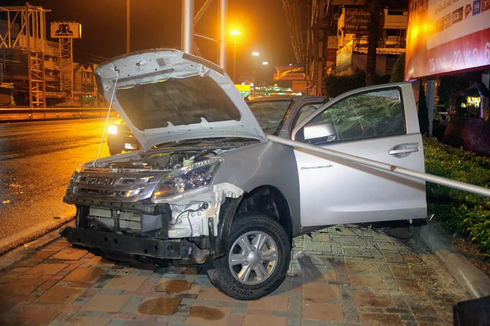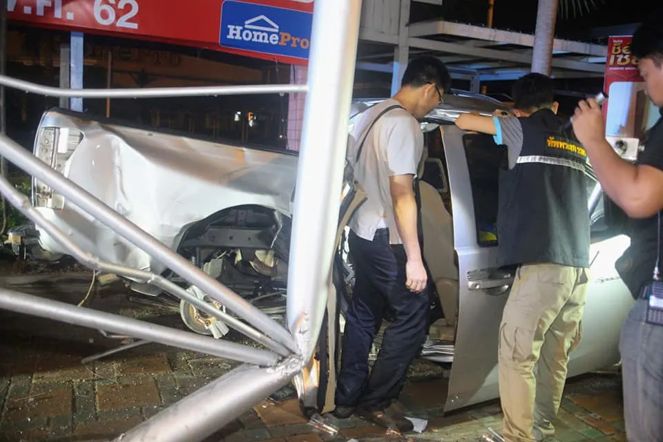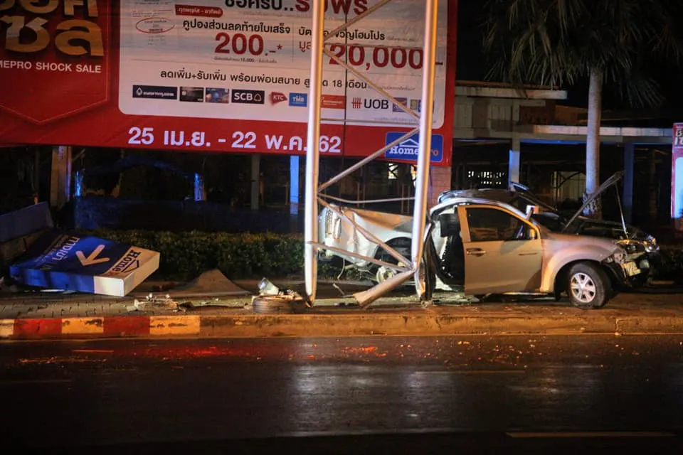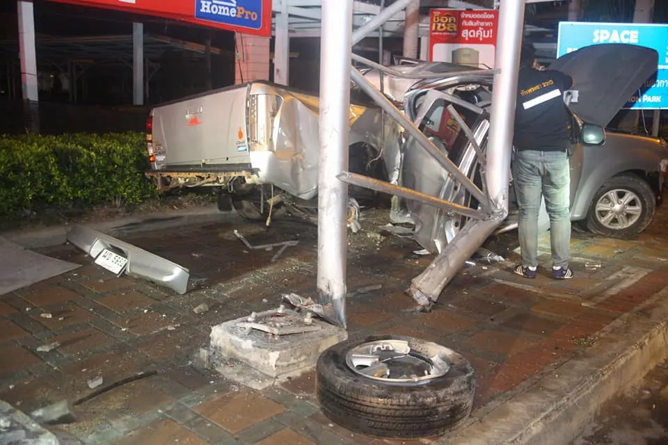 ที่เกิดเหตุพบรถยนต์กระบะยี่ห้อ อิซุซุ ดีแม็ก สีบร์อน หมายเลขทะเบียน ผข 5982 อุบลราชธานี มีนายธนาดล ต้นสิน อายุ 36 ปี พนักงานโรงแรมย่านพัทยา อยู่ในอาการมึนงงยืนดูรถที่เสียหลักขึ้นฟุตปาธชนป้ายบอกทางขนาดใหญ่จนเสาขาด และป้ายทางเข้าออกของโฮมโปร ได้รับความเสียหาย ส่วนตัวรถก็ได้รับความเสียหายยับเยินเช่นกัน พร้อมถามว่าทำไมผมไม่ตาย แต่ได้รับบาดเจ็บเพียงเล็กน้อยเจ้าหน้าที่กู้ภัยฯได้เคลื่อนย้ายส่งโรงพยาบาล