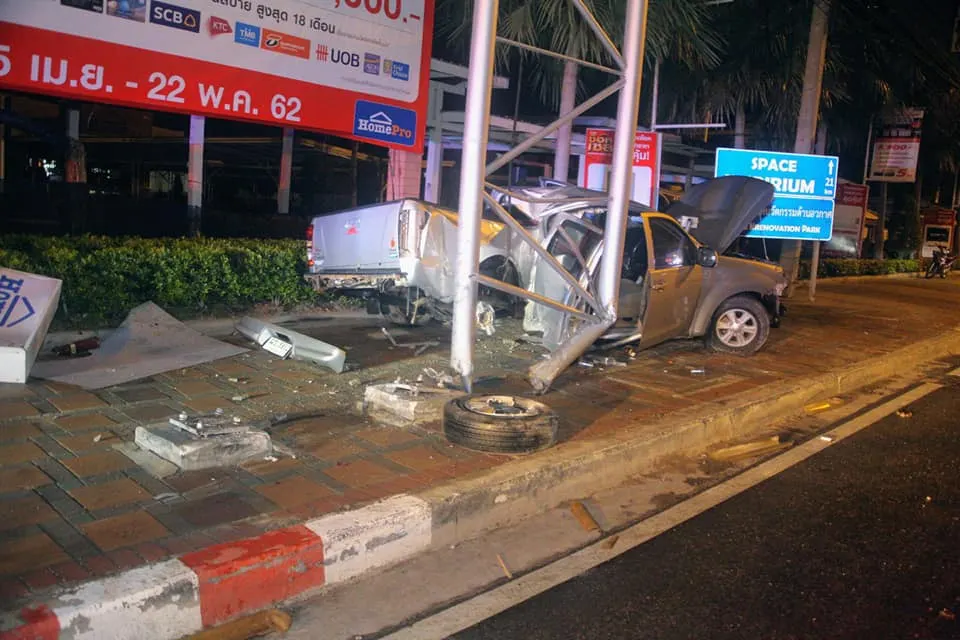 ถนนลื่นพนักงานโรงแรมซิ่งกระบะชนเสาป้ายบอกทางพังยับ