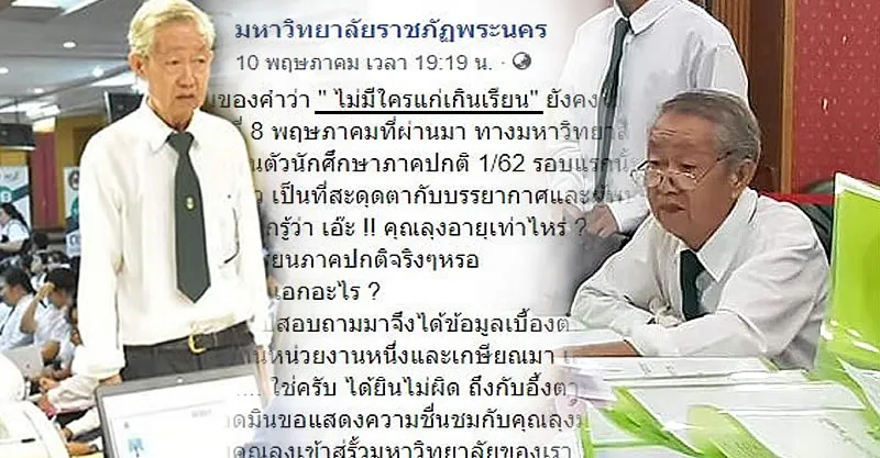 เป็นเรื่องราวดี ๆ และสร้างแรงบันดาลใจในการเรียนรู้อย่างมาก หลังเฟซบุ๊ก มหาวิทยาลัยราชภัฏพระนคร ได้เผยภาพในงานประกาศรับรายงานตัวนักศึกษาภาคปกติ 1/62 รอบแรก พบว่ามีชายสูงอายุคนหนึ่งเข้ามาลงทะเบียนเรียนในครั้งนี้ด้วย