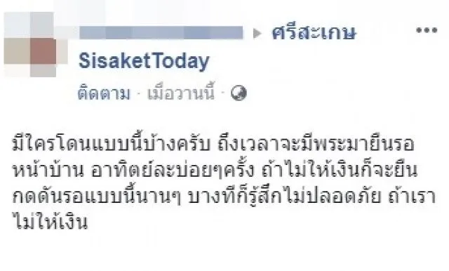 เป็นอีกหนึ่งเรื่องราวที่ชาวเน็ตแห่แชร์ และให้ความสนใจกันเป็นจำนวนมาก เมื่อมีผู้ใช้เฟสบุ๊คชื่อ ศรีสะเกษ SisaketToday ได้ออกมาโพสต์ภาพและเรื่องราวโดยได้ระบุข้อความว่่า..."มีใครโดนแบบนี้บ้างครับ ถึงเวลาจะมีพระมายืนรอหน้าบ้าน อาทิตย์ละบ่อยๆครั้ง ถ้าไม่ให้เงินก็จะยืนกดดันรอแบบนี้นานๆ บางทีก็รู้สึกไม่ปลอดภัย ถ้าเราไม่ให้เงิน"