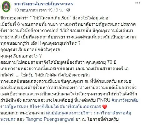 สำหรับคำที่ว่าไม่มีใครเเก่เกินจะเรียนนั้น เรียกได้ว่าข้ามยุคสมัยมาถึงสมัยนี้เลยทีเดียวนั้นเองเพราะว่าเมื่อช่วงวันที่ 8 พฤษภาคม ที่ผ่านมา ทาง ม ห า วิ ท ย า ลั ย ราชภัฏพระนคร ประกาศรับรายงานตัวนักศึกษาภาคปกติ 1/62 รอบแรกนั้นอยู่ดีๆได้มีคุณลุงท่านนึงเดินมารายงานตัว เป็นที่ดึงดูดสายตากับ บ ร ร ย กาศ อ ย่ า ง มากเลยทีเดียวเเละเเน่นอนว่าทุกคนคงสงสัยว่าคุณลุงอายุเท่าไหร่ คุณลุงมาเรียนภาคปกติจริงหรือป่าวเเละที่เเน่นอนนั้นคุณลุงเรียนเอกอะไรหล่ะ สอบถามไปสอบถามมาจึงได้ข้อมูลเบื้องต้นว่า คุณลุงอายุ 70 ปี เคยทำงานหน่วยงานหนึ่งและเ ก ษี ย ณ มา เลยมาลงเรียนสาขาดนตรี เอกกีต้าร์ นั้นเอง