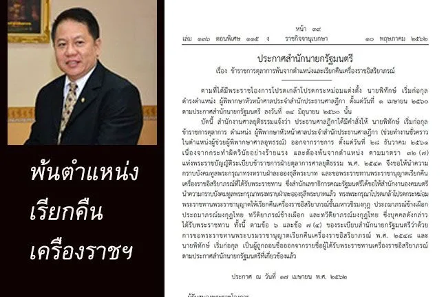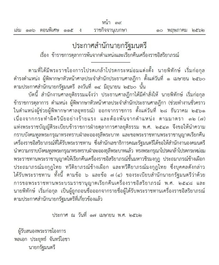 ประกาศสำนักนายกฯให้'พิทักษ์ เริ่มก่อกุล'พ้นตำแหน่งผู้พิพากษาหัวหน้าศาลฯและเรียกคืนเครื่องราชอิสริยาภรณ์